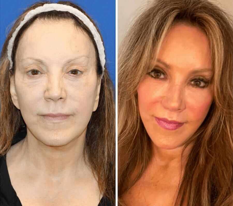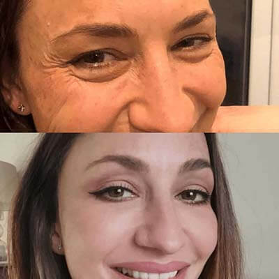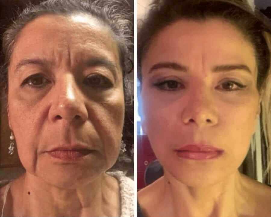 — Las reglas clásicas que habrás escuchado innumerables veces: un buen sueño y una alimentación adecuada, pero sería una mentira si te dijera que es suficiente. Mi marido es un especialista licenciado que trabaja en colaboración con laboratorios. Hace unos 10 años, fue el primero en desarrollar una fórmula rejuvenecedora llamada Simpla 360 . Yo fui la primera voluntaria en participar en los ensayos clínicos. En ese momento, tenía 37 años y, por supuesto, ya tenía arrugas, manchas pigmentadas, etc.